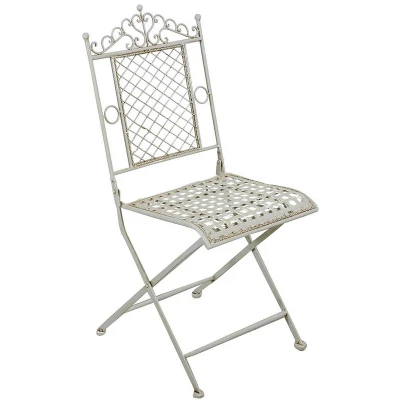 General description The Folding Wrought Iron Chair is a solid and sturdy piece of furniture designed for both indoor and outdoor use. With its vintage rustic style and antique white finish, this chair adds a charming touch to any space, whether it be a garden, terrace, or interior room. Its meticulous workmanship ensures durability and aesthetic appeal, making it a versatile addition to your home. Technical specifications Material: Full wrought iron with antique finish Dimensions: 49 cm (W) x 96 cm (H) x 41 cm (D) Usage Ideal for gardens, terraces, and verandas Can be used indoors in kitchens, living rooms, or bedrooms Matches well with any garden set Other information Folding design for easy storage Resistant material guarantees excellent durability over time