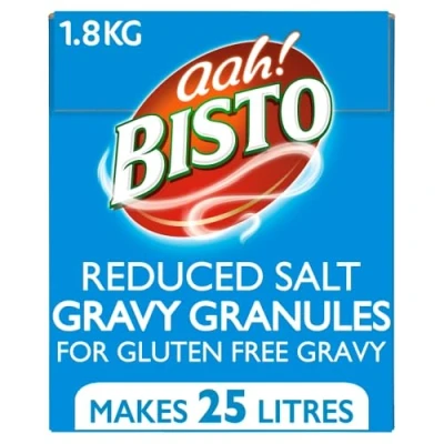 WHAT DO I RECEIVE: A 1.9kg pack of delicious, reduced salt gluten free gravy granules for authentic, home-cooked meals every time FEATURES: Made with premium ingredients for a rich and flavoursome British taste experience. Vegetarian and vegan-friendly TASTE: Enjoy the thick and savoury texture of this gravy, perfect accompaniment to any meal HEALTHY CHOICE: Reduced salt content without compromising on taste or flavour, suitable for those looking to enjoy traditional recipes with less sodium VERSATILE: Whether it's a Sunday roast or midweek dinner, Bisto Gravy Granules will elevate your dishes with its full-bodied flavour profile