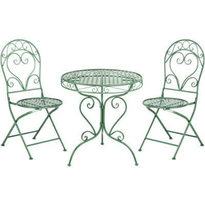 General description This beautiful 3-piece bistro set, designed with a vintage touch, is an eye-catching addition to any garden or balcony. Its green, powder-coated frame features gorgeous open scrollwork, creating a romantic vibe. Made from iron, this outdoor set is easy to clean and, with proper maintenance, will last for many years. Technical specifications Product Type: Bistro Set Style: Retro General Color: Green Material Type: Metal Main Material: Iron Top Material: Metal Finish: Powder Coated Seats Up To: 2 People Chair Dimensions: 42x55x94 cm Coffee Table Dimensions: 70x70x74 cm Seat Height: 45 cm Overall Dimensions: 70x70x74 cm Weight: 17 kg Chair Weight Capacity: 110 kg Table Weight Capacity: 5 kg Installation Partial Assembly Required Assembly time: Approximately 15 minutes Usage To increase durability, keep the furniture dry and clean regularly. Use commercially available mild cleaners for cleaning. Avoid alkaline or acid-based cleaners to ensure corrosion protection. When