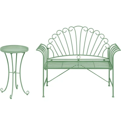 General description Add a vintage charm to your garden, balcony, or terrace with this gorgeous Bistro Set CAVINIA. This outdoor 2-seater set consists of a robust iron bench and a complementary side table, perfect for enjoying coffee and magazines in a stylish setting. The bench features a decorative backrest and flared arms, inspired by old-time glamour, making it an ideal match for retro and traditional decor styles. Technical specifications Product Type: Bistro Set Style: Retro General Color: Green Main Material: Iron Top Material: Metal Finish: Powder Coated Seats Up To: 2 People Chair Dimensions: 125x46x97 cm Coffee Table Dimensions: 40x40x64 cm Seat Height: 42 cm Overall Dimensions: 125x46x97 cm Weight: 16 kg Chair Weight Capacity: 240 kg Table Weight Capacity: 8 kg Installation Full assembly required (20-40 min). Usage Light water resistance allows for outdoor use during light rain and humid conditions. Recommended to use a cover when not in use if storing indoors is not