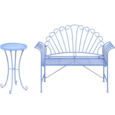 AmazonClassic balcony set consisting of a bench and a side table in vintage design, ideal addition to any patio, garden or balcony Made from robust and durable metal in bold, blue finish Bench features a decorative backrest and flared arms for an elegant look Comfortable seating for 2; the table provides additional space for the morning coffee and magazines Simple assembly, all manuals provided