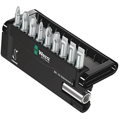 Rapidaptor bit holder with quick-release chuck for rapid one-handed bit changes for insert and power bits Description: 10-piece bit assortment BIT-CHECK 10 UNIVERSAL 4 BITS ASSORTMENT Torsion Design Against premature wear Torsion shape to prevent premature wear Universal holder with stainless steel sleeve, snap ring and strong permanent magnet, Weight: 0.19 pounds, Manufacturer: WERA