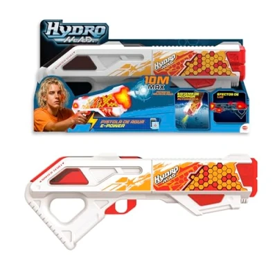 Hydro Mad Blaster electric water gun in white and red, designed for intense water battles. It has automatic reloading system, to get back in the game quickly without losing action. It offers a range of up to 10 meters, firing powerful bursts of water with great precision. It incorporates LED light effects, which bring extra excitement and visibility during the game. Includes rechargeable battery, ideal for extended sessions; recommended for children 8 years and up., Manufacturer: Bizak