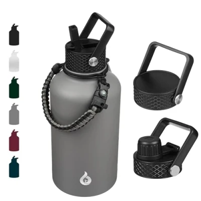 BJPKPK Half Gallon Insulated Water Bottles with Straw Lid, 64oz Large Cups, Stainless Steel 3 Lids and Paracord Handle, Thermos for Hot & Cold Liquid, Gray