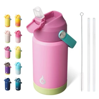 BJPKPK Insulated Water Bottle with Straw Lid, 12oz Thermos Bottles, Flex Handle & Non Slip Boot, BPA Free Leak Proof Stainless Steel Metal Cups, Tumblers, Cups,Rose Pink