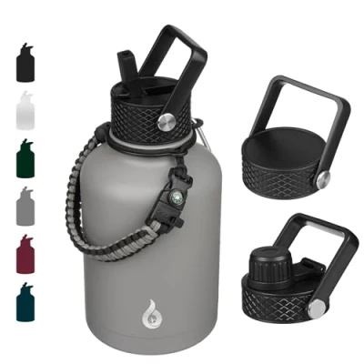 BJPKPK Insulated Water Bottles with Straw Lid, 50oz Large Cups, Stainless Steel Vacuum Bottles, Hot & Cold Thermos 3 Lids and Paracord Handle,Gray