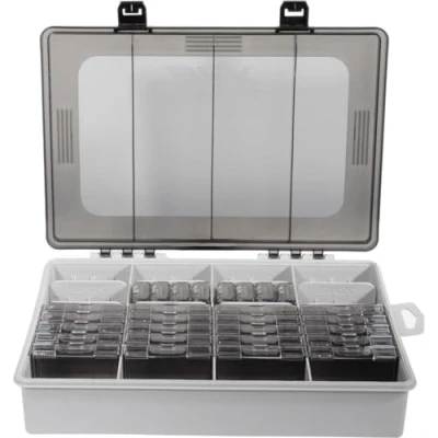 BKK OCD Tackle System A2 Loaded M - Tackle storage system - Brand: BKK - Comes with 20 Medium and 8 Small OCD accessory boxes! - Dimensions: 30×22×7cm - Made of sturdy polypropylene - Strong closures for added security - Waterproof seal against moisture and dirt - Suitable for BKK Armor Point Hook Storage Boxes (sold separately) - Provides space for 80 small or 44 medium-sized Accessory Boxes - Modular and customizable storage system The BKK OCD Tackle System A2 Loaded M is a complete storage system for anglers who want to keep their hooks and small equipment perfectly organized. The sturdy tackle box features a waterproof seal and strong closures to keep your gear well protected. This edition comes with 20 medium and 8 small accessory boxes, ideal for keeping different hook sizes and accessories organized. The modular design allows you to customize the layout and add additional boxes. Perfect for anglers who want to hit the road efficiently and well prepared!