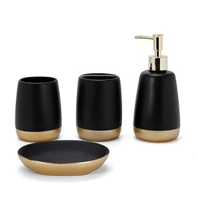 Set Includes :1 Soap Dispenser, 1 Toothbrush Holder, 1 Toothbrush Cup, 1 soap dish Elegant Design :The black with gold color take your bathroom decor to stylish new heights with this bathroom accessories set, very stunning and a great touch of extra elegance to the bathrooms, perfect for giving as a gift for housewarming or a wedding Durable And Amazing Quality : This 4-Piece Bathroom Accessory Set is made of durable high quality ceramic that can outlast competing products . Our high quality ceramic bath accessories will resist to constant use, keeping their look just as elegant and new over time Premium Quality Liquid Soap Dispenser Pump : We know how frustrating it can be to use a flimsy pump that leaks or just does not work. No matter how your bathroom set looks like, a bad pump can ruin the experience. That’s why we included a hard plastic pump for the liquid soap dispenser in this set 365-day ************************************************************* *************************************************************, worry-free 24-month *************************************************************, and friendly customer service by Ava's Homedecor