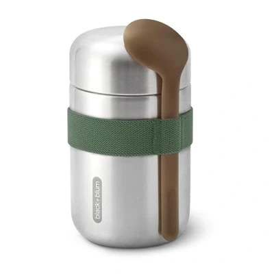 BLACK + BLUM Food Flask Vacuum Insulated 304 Stainless Steel Container with Leak Proof Lid, Nylon Strap and Natural Wood Fibre Spoon Keeps Hot for 6 hrs, Cold 8 Olive 400ml