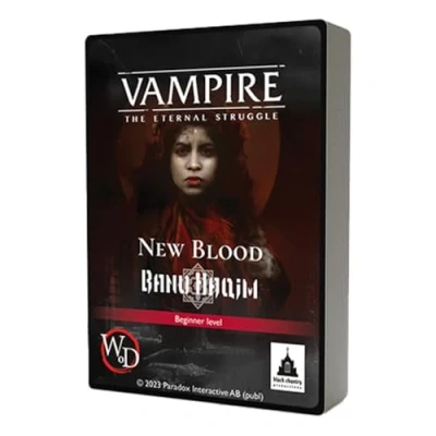Experience the plot of Vampire: The Eternal Struggle with "New Blood Banu," featuring five preconstructed decks. Delve into the ancient bloodline of Clan Banu Haqim, balancing law, tradition, and the cutthroat world of vampiric politics. Master the art of stealth, threats, and violence as you command vampires with both political influence and combat prowess. Includes a mix of reprinted classics and exclusive new cards, ready to integrate seamlessly with other sets. Perfect for newcomers seeking a balanced and exhilarating introduction to the dark and immersive world of Vampire: The Eternal Struggle., Manufacturer: Black Chantry Productions