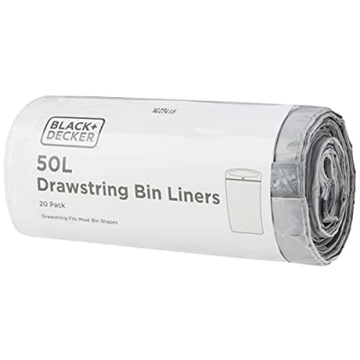 Universal fit – The bin liners fit perfectly with all BLACK+DECKER 50 litre bins (can also be used with other 50 litre models) Strong and durable – the high grade bag thickness prevents rips, tears and spillages Dispenser roll – The bin liners are packaged on an easy to use dispenser roll which makes it easy to remove one bag at a time Strong tie handles – the elasticated drawstring handles make the liners easy to remove, lift, tie and carry once full and reduce the risk of rips, tears and spillages