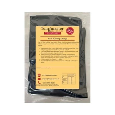 Plain non-edible plastic, high quality and strong - 3lb pudding casing. Perfect for producing puddings, haggis, salami’s & more – great for home use, or for business or catering. Each piece is clipped and looped for hanging if required. Suitable for a temperature range from -40℃+110℃ and has a burst pressure of 20 kPA. Maintains product weight/shape due to minimum moisture loss while its high oxygen barrier extends the products shelf life. Fully immerse in warm water (