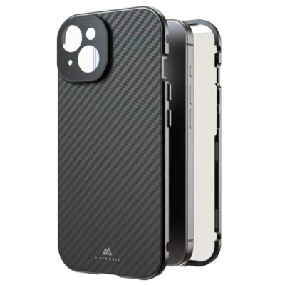 Protective case for iPhone 15 in elegant look: real carbon coating, robust metal frame, very high-quality aluminium camera protection, 360° complete protection Ultra-thin mobile phone case with magnetic closure: 0.7 mm thin back, 0.5 mm thin front, interference-free magnet for easy installation Mobile phone protection without compromise: perfectly fitting case to protect the iPhone, free access to all buttons and inputs, unrestricted operation of the entire touch display Compatible with wireless charging: mobile phone can be charged wirelessly without having to remove the case - so the iPhone remains protected even during wireless charging Box contents: 1x Black Rock cover "360° glass" for Apple iPhone 15, with carbon coating