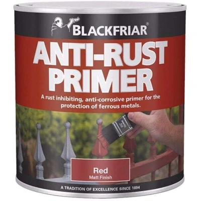 General description Blackfriar Anti-Rust Primer Quick Drying is an all-in-one primer and undercoat designed to prepare surfaces for painting with Blackfriar Metal Paint. It provides excellent rust protection and is easy to apply, making it suitable for both industrial and home use, including applications on machinery, cars, bicycles, garden furniture, gates, railings, and garage doors. Technical specifications Color: Red Size: 250ml Type: Metal Primer Coverage: approximately 14m² per liter per coat Touch Dry Time: 2-4 hours Hard Dry Time: 3 days Recoatable after: 16 hours Installation Apply with a brush or roller to clean, dry metal surfaces. Ensure even coverage for optimal rust protection. Usage Apply a coat of primer to clean and dry metal surfaces before painting. Allow sufficient drying time between coats and before applying the topcoat. Other information