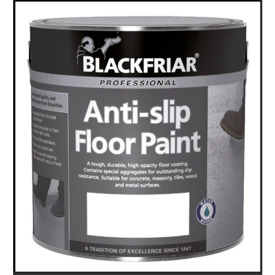 General description Blackfriar Anti-Slip Floor Paint is a tough and durable high-opacity floor coating designed to provide outstanding slip resistance. It is specially formulated for foot and light traffic areas, making it ideal for both indoor and outdoor use. Technical specifications Volume: 1 Litre Coverage: 6-10 m²/L/Coat Hard Dry Time: 4 - 6 hours at 20ºC Recoatable Time: 16 hours Type: Solvent-based Compatibility and accessories Suitable for concrete, masonry, wood, and metal surfaces Usage Ideal for foot and light traffic areas Provides an aggregated finish for total slip-resistance