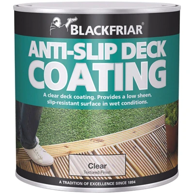 General description Blackfriar Anti-Slip Deck Coating is a clear deck coating that enhances the natural beauty of wood while providing a slip-resistant surface. It is ideal for exterior timber decking and walkways, ensuring safety without compromising aesthetics. Technical specifications MPN: BKFASDC25L EAN: 5013296115056 Colour: Transparent Size: 2.5L Coverage: 9m²/L/Coat Touch Dry: 4-6 hours Hard Dry: 3 days Recoatable: 12 hours Application Method Brush Roller Other information