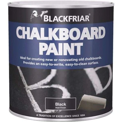 General description Blackfriar Chalkboard Paint creates a durable matte black surface suitable for chalk writing. It resists ghosting, ensuring clear and legible chalk marks, making it ideal for creating new chalkboards or renovating existing ones. Technical specifications Type: Paint Size: 250ml Coverage: approximately 14m² per liter per coat Touch Dry: 16 hours Hard Dry: 16 hours Re-coatable: after 16 hours Compatibility and accessories Suitable for use on various surfaces compatible with chalkboard paint Application methods include brush and spray Installation Apply with a brush or spray for best results Ensure the surface is clean, dry, and smooth before painting Apply multiple coats if necessary, allowing drying time between coats Usage Use chalk to write on the painted surface once fully dry Allow at least 16 hours for drying and curing before use Other information Durable finish suitable for frequent use