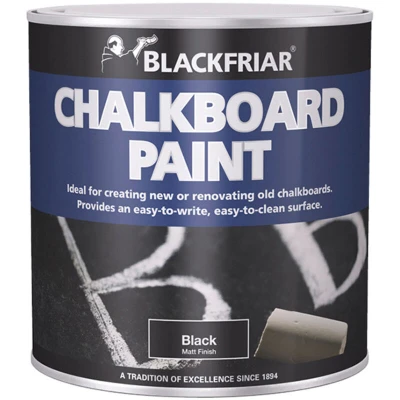 General description Blackfriar Chalkboard Paint creates a durable matte black surface suitable for chalk writing. It resists ghosting, ensuring clear and legible chalk marks, making it ideal for creating new chalkboards or renovating existing ones. Technical specifications Size: 500ml Type: Paint Coverage: approximately 14m² per liter per coat Touch Dry: 16 hours Hard Dry: 16 hours Re-coatable after 16 hours Compatibility and accessories Suitable for use on various surfaces to create a chalkboard finish Installation Apply with a brush or spray for an even finish Ensure the surface is clean and dry before application Allow 16 hours to dry between coats and before use Usage Use chalk to write on the painted surface once dry Allow the surface to dry for 16 hours before writing or erasing Other information