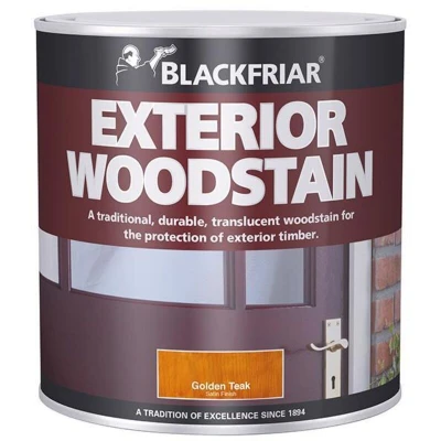 General description Blackfriar Traditional Exterior Woodstain in Golden Teak is designed to stain, protect, and finish exterior timber. It is suitable for use on all hard and softwoods, providing a weather-resistant, water-repellent satin finish that resists flaking, peeling, and cracking. The microporous formula allows the wood to breathe, helping to maintain its natural appearance. Technical specifications Color: Golden Teak Size: 500ml Type: Woodstain Application method: Brush or roller Coverage: Approximately 14m² per liter per coat Touch dry: 2-4 hours Hard dry: 7 days Recoatable: After 16 hours Compatibility and accessories Suitable for all types of exterior hard and softwoods Can be applied with brushes or rollers Installation Ensure the surface is clean, dry, and free from loose particles before application. Apply evenly with a brush or roller, following the grain of the wood. Allow sufficient drying time between coats as specified. Usage Apply on clean, dry, and prepared wood
