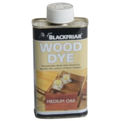 General description Blackfriar Wood Dye penetrates deep into wood to enhance and enrich the natural colour of bare timber. It is suitable for use on new interior and exterior timber, plywood, and chipboard. The dye can be mixed with other shades to create custom colours. Available in nine attractive shades, including Medium Oak. Technical specifications Size: 250ml Colour: Medium Oak Coverage: approximately 30m² per litre per coat Touch dry time: 1-3 hours Recoatable after: 24 hours MPN: BF0800002F1 EAN: 5013296250221 Installation Apply with a brush or cloth to clean, dry wood surfaces Ensure even coverage and allow to dry thoroughly before recoating Usage Use to colour bare wood for decorative or protective purposes Mix different shades to achieve custom colours Other information