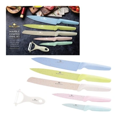 Stainless Steel with Marble Coated BladesThe Blackmoor Home Knife set contains 3 x 8 inch knives - Chef, Slicer and Bread Knife, 1 x 5 inch paring knife, 1 x 3.5 inch paring knife and 1 x ceramic swivel head vegetable peeler.The Blackmoor Home Marble Coated Knife Set with Ceramic Peeler comes in a magnetic close gift presentation box.The knives are made out of stainless steel with an antibacterial non-stick marble coating. They are lightweight with ergonomic knife handles for added comfort and control.
