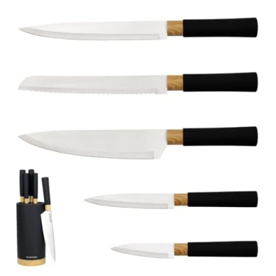 5 PIECE KNIFE SET - This 5-piece stainless steel knife set includes all the essentials for your kitchen - a versatile 8-inch chef’s knife, 8-inch bread knife, 8-inch carving knife, 5-inch utility knife, and a 3.5-inch paring knife. Perfect for slicing, dicing, chopping, and carving meats, fish, vegetables, and bread with precision. ROUND STORAGE BLOCK - When not in use, the knives sit neatly in the included freestanding knife block. Its sleek, matte cylinder design adds a modern and sophisticated touch to your countertop while keeping your knives organised and easily accessible. SOFT TOUCH HANDLES - The handle of each knife is thoughtfully designed with a soft-grip material for a secure hold. This enhances precision, promotes stability during use and reduces hand fatigue, making it a perfect choice for both professional chefs and home cooks. DURABLE STAINLESS STEEL - Crafted with high-quality stainless steel, these rust-resistant knives offer exceptional durability, sharpness, and precision, making meal prep effortless for many years to come. They are easy to clean by hand, making them a practical and stylish addition to your kitchen essentials. BLACKMOOR - Blackmoor is the market-leading provider of the very best kitchen essentials to inspire the everyday home cook. Find everything from pots and pans, to knife sets, bakeware essentials and cooking utensils all at the Blackmoor Amazon store page today!, Weight: 2.20462262 Pounds, Manufacturer: The Benross Group
