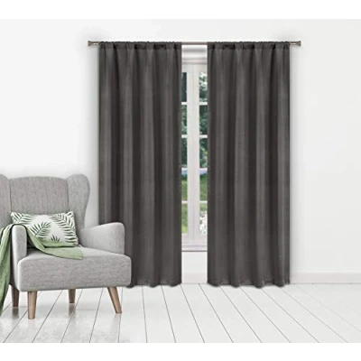 Amazon Heighten the drama of your elegant living room by adding these Ira Solid Blackout Room Darkening Curtains. Their blackout features include noise reduction, room darkening, energy saving insulation, and protection from harsh sunlight. Beautifully made, they'll frame your windows while keeping out unwanted light, making your living space even cozier. Hang them in your home today, and make them the focal point of any room you choose. Measures 38x84" (2 Pieces) Includes 2 window panel curtains Insulated - Help your curtain keep the heat and cold out polyester fabric with natural blackout features, thick and heavy duty make the draperies more durable and long lasting, burlap effect will bring more vintage and graceful look to your window and room Blackout features include noise reduction, room darkening, energy saving insulation, and protection from harsh sunlight