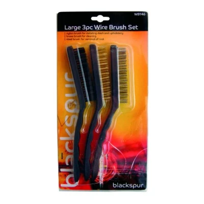 Product Description Blackspur large 3 piece wire brush set includes a nylon brush for detailing dash and upholstery, a brass brush for cleaning and steel brush for removing rust with slide blister packaging. Supplying quality products. One of the most comprehensive ranges of hand tools and DIY associated products in the UK. Key Features Nylon, brass and steel brushes Comfortable grip handles Detailing dash and upholstery Brass brush for cleaning and steel brush for removing rust Supply in slide blister Box Contains 3x Wire Brush