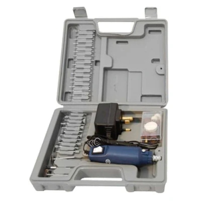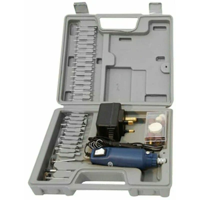 General description Professional quality mini drill grinder engraver rotary drill kit designed for craft and DIY model making. This versatile tool is perfect for a variety of tasks including grinding, drilling, and engraving. It is lightweight and easy to use, making it ideal for both beginners and experienced users. The kit includes a range of accessories and an AC-DC adaptor, all supplied in a blow-moulded storage case. Technical specifications Includes 1 grinding stone 1 carbide point (3/32" shank) 2 drill bits (2mm and 3mm) 2 buffing wheels (1/8" shank) 3 brass collets 3 wire wheels (3/32" shank) 4 woollen cleaning wheels 1 mandrel (1/8" shank) 6 cut-off wheels 1 thread lock mandrel (1/8" shank) 6 sanding drums 10 mounted stones (3/32" shank) 20 diamond points (3/32") Spindle lock for easy changing of accessories