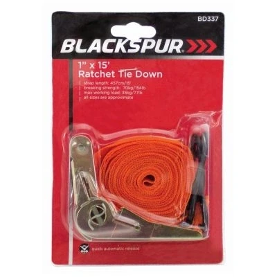 SPECIFICATIONIdeal for keeping your goods safe, secure & tight, this ratchet tie down is manufactured from polypropylenewith 2 coated ‘S’ hooks & has an adjustable length. The J type ratchet handle is manufactured from zincplated iron. It should not be used for lifting or towing vehicles.Approx Strap Length: 2.5cm/1” x 457cm/15’ Breaking Strength: 70kg/154lbMax Working Load: 35kg/77lbBARCODE 5017403 071471CARTON QTY 24/0 Pcs APPROX ITEM WEIGHT 174gPACKAGING Slide Blister