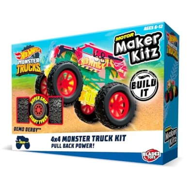 BLADEZ Hot Wheels Monster Trucks, 4x4 Pull Back Vehicle for kids, Licensed Build Kit, Assortment of Colours and Styles, 6 to collect, Motor Maker Kitz Toyz
