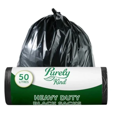 Heavy-Duty Black Sacks: Blake & White Purely Kind Heavy Duty Black Sacks are designed for strength and durability, offering 50L capacity per bag, Ideal for various household and outdoor uses, these sacks handle general waste, including kitchen, office, and bathroom trash : Made from at least 98 percent post-consumer scrap plastic, these bags are not only sturdy but also help reduce your environmental impact, Fully recyclable, they ensure your waste management is more eco-conscious without compromising on quality Leak-Resistant Design: The leak resistant feature of these black bin bags ensures secure handling of waste, whether for indoor or outdoor use, Perfect for kitchen, bathroom, office, or pet waste, these bags will keep your surroundings clean and dry Usage Instructions: Simply fill the bags with household or general waste, With 30 bags per roll, they’re perfect for regular waste disposal, Once full, easily tie and dispose of them, knowing they’re recyclable Our Story: Blake & White has a rich history that spans over four decades, beginning as a janitorial supply company and evolving into a respected leader in the cleaning and healthcare industry, We prioritize ethical sourcing and sustainability, empowering everyone to lead cleaner, healthier lives with accessible, cleaning and healthcare products for businesses and individuals alike