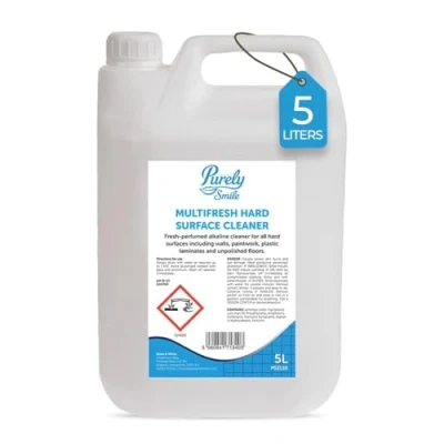 Purely Smile Multifresh Hard Surface Cleaner 5 Litre: The Blake & White PS2110 Purely Smile Multifresh Hard floor Cleaner is a versatile liquid cleaner designed for effective use on various hard surfaces, This 5-litre floor cleaner is Suitable for maintaining cleanliness in areas that require frequent washing, such as kitchen floors and worktops, Popular Alkaline Cleaner: This alkaline floor cleaner liquid is well-regarded for its ability to remove scuff marks and grime effortlessly, Its formulation ensures that it can tackle tough cleaning tasks while leaving surfaces looking refreshed Fresh-Perfumed Scent: The surface cleaner features a fresh, perfumed scent that not only cleans but also leaves a pleasant fragrance in the environment, This makes it suitable for both housekeeping and commercial cleaning applications No Rinse Required: The no-rinse feature of this floor cleaner simplifies the cleaning process, allowing for quick application and minimal effort in achieving clean surfaces, This characteristic makes it particularly useful for busy environments where efficiency is key Surface Compatibility: The multifresh floor cleaner liquid is suitable for a variety of surfaces, including floors, walls, paintwork, and plastic laminates, Its effectiveness across different materials ensures that it can be used throughout the home or workplace without concern for damage Our Story: Blake & White has a rich history that spans over four decades, beginning as a janitorial supply company and evolving into a respected leader in the cleaning and healthcare industry, We prioritize ethical sourcing and sustainability, empowering everyone to lead cleaner, healthier lives with accessible, cleaning and healthcare products for businesses and individuals alike,