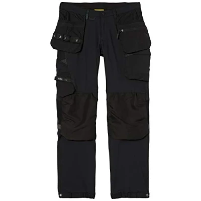 Fabric: 92% polyamide, 8% elastane, double woven, 4-way stretch, 230 g/m² Functionality: 4-way stretch Reinforcement: Cordura reinforcement on hanging pockets, back pockets, ruler pocket, leg pockets, knees and lower edge, Cordura stretch reinforced knee pockets Plastic zip in the crotch, two loops on the sides with a button for hammer holder, wide loop at the back, metal buttons, knife holder with button, D-ring on the waistband, crotch seam as double seam, removable ID pocket Reflective details on the leg
