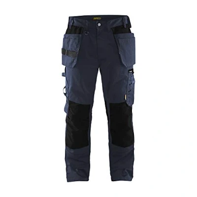 Fabric: 65% polyester, 35% cotton, twill, 300 g/m². Reinforcement: Cordura reinforcement on the back pockets, Cordura stretch reinforced knee pockets Plastic crotch zip Two belt loops on the sides with a button for a hammer loop, a belt loop with D-ring at the front. Wide belt loop at the back, metal buttons, inner seam with triple stitching. Removable ID pocket. Back pockets with bellows reinforced leg pocket with bellow, pen pocket, flexible mobile phone case and two large pockets - one with zip, removable ID pocket, side pockets, knee pad pockets, nail pockets - with tool loops, can be slipped into the front pockets Reinforced ruler pocket with knife holder and pen pocket.