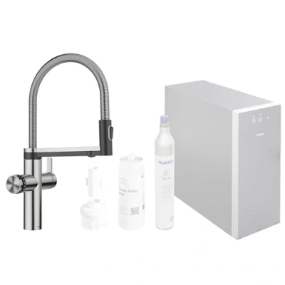 Gourmet Water The tap provides filtered water that can be cooled, carbonated (still, medium, classic) or boiling hot, in addition to normal cold and warm tap water. Intuitive tap operation with a separate tap water lever on the right side and a rotary dial with touch control on the left side for options for treated water. Additional spout for treated water - no mixing with tap water Gourmet water of your choice for the discerning taste. Flexible spring hose with two selectable jet types and precise magnetic holder for comprehensive functionality of the kitchen tap in preparation and cleaning processes. Available in solid stainless steel, matt black, satin gold and satin dark steel. Box contents: 6-in-1 semi-professional tap. Still, medium, bubbling or boiling: the water type can be selected by operating a separate rotary wheel. Click & Touch: selection of the pre-defined amount of water treated thanks to the rotary wheel and the intuitive touch control. Safety concept for safe handling of boiling water. Double-jet shower for mixed water can be operated on both sides. with magnetic holder 180° swivel spout for mixed water and refined water Material: stainless steel | tap hole with a diameter of 35 mm required | with ceramic discs | patented aerator for significantly lower calcification | various flexible connection hoses and connection bends for particularly easy and safe installation | stabilising plate to increase the stability of the fitting when installed in stainless steel sinks., Weight: 5.51155655 pounds, Manufacturer: BLANCO