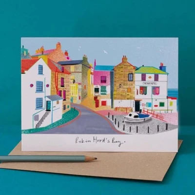 Blank Card Colourful Robin Hood Bay Mixed Media Landmark Artwork
