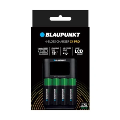 Blaupunkt Advanced charger can charge 1-4 Ni-MH batteries (AA or AAA). It takes approximately 1 hour to fully charge 4 AA (2000mAh) batteries. Includes 4 AA 2000 mAh Blaupunkt batteries perfect for high drain devices and a USB cable (50 cm). Individual charging control (-Delta V) with LCD display status control Contains reverse polarity, bad cell, thermal and short circuit protection features to maximize user's safety. 100% plastic free packaging