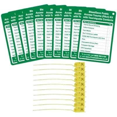 BLEEDSAVE Public Access Trauma Kit Inspection Tag Pack (Tourniquet) Tags + Tamper Ties Pact Tourniquet Checklist 130x85 mm (10 Pack)