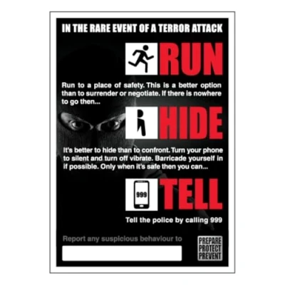 Bleedsave Run, Hide, Tell Poster In The Event Of A Terror Attack 420 x 594 mm (A2) Standard 0.2mm Flexi Plastic