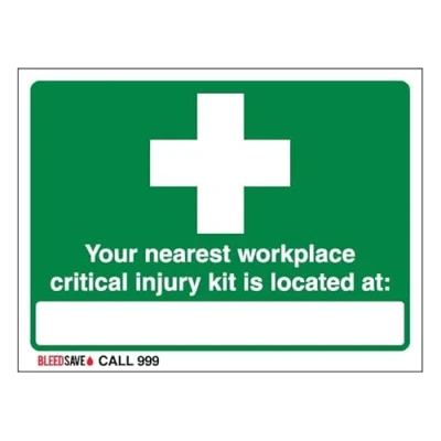Bleedsave The Nearest Workplace Critical Injury Kit Is Located Call 999 200 x 150 mm 2mm Rigid Plastic Safety Sign