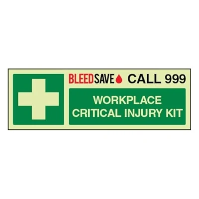 Bleedsave Workplace Critical Injury Kit Call 999 Landscape 300 x 100 mm Glow In The Dark Self Adhesive Vinyl Safety Sign