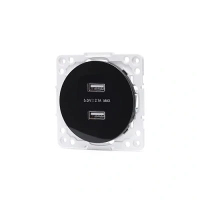 Dual USB port adapter in stylish black color, allows you to charge multiple devices at the same time, ideal for keeping your home or office always connected and tidy.
