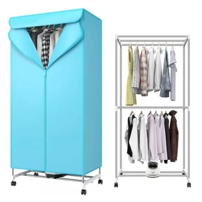 【Automatic Intelligent Control】180 minutes can be timed design, The intelligent control helps dry clothes regularly and meets the needs of different clothes.the automatic power-off setting guarantees the safety 【Powerful Clothes Drying Effect】PTC heating, the heat inside the dryer can be circulated and flow. it can accelerate the speed of drying.1000W powerful heater is quiet and efficient, and will not disturb the rest even at night 【Various Clothes Drying】2 tiers of hanging drying space giving you even more drying capacity.for reasonably organizing the drying area of the clothes 【Premium Materials】The dryer cover is made of high-density Oxford cloth to ensure internal tightness, preventing the entry of bacteria and dust for better drying. Maintains clothes and eliminates unpleasant odors. Stainless steel frame withstands 15kg(33lb) of clothing