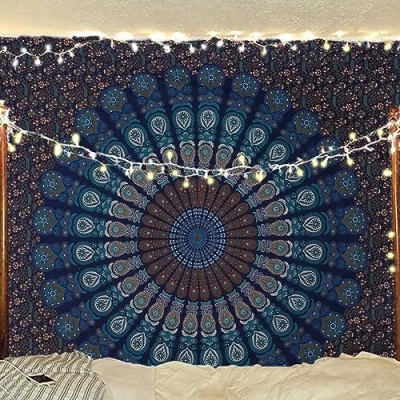 Bless International Indian hippie Bohemian Psychedelic Peacock Mandala Wall hanging Bedding Tapestry (Blue Green, King (88x104Inches)(225x265Cms))
