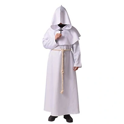 BLESSUME Monk Costume Medieval Hooded Priest Robe Renaissance Friar Cowl Outfit (XL, White)