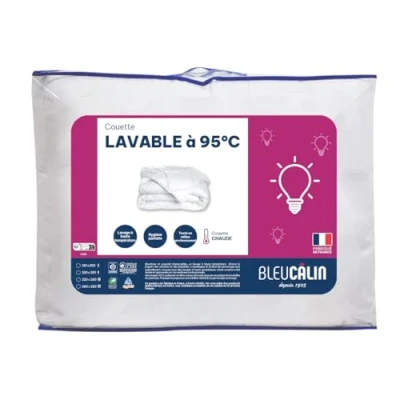 Double Duvet Machine Washable at 95 C, Tumble Dry Impeccable white and cleanliness, elimination of mites and bacteria, Hygiafill label tested and approved by many professionals Warm 400 g/m², for all year round except in summer, polyester hollow fibre filling. Exterior: 100% Polyester Microfiber French product, environmentally friendly production from renewable energy sources (solar, wind turbine, water electricity...) Contents: 1 x blue quilt, washable at 95 °C, KBOB40240MIFI, size: 260 x 240 cm, for double bed, colour: white, diamond quilt, comes in a case with storage box with zip closure