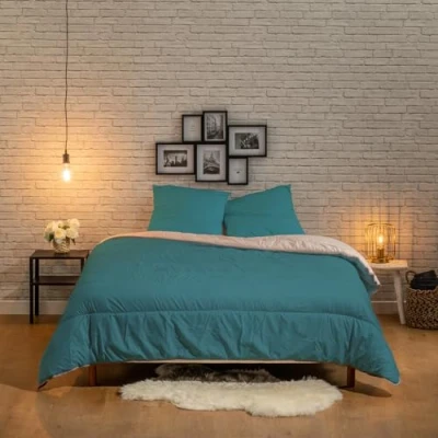 Reversible quilt for 1 person, adds a decorative touch to your bedroom, can be used as a bedspread or sofa throw Warm 400 g/m² for all year round except summer. Filling: siliconised polyester hollow fibre Extra soft peach skin feel 100% polyester cover, machine washable at 40°C, quick drying Made in France. Environmentally friendly production from renewable energy sources (solar, windmill, water flow) Box contents: 1 x duvet in blue Câlin microfibre RM40AP0, size: 140 x 200 cm (1 person), colour: teal agate/grey, duvet comes in a zipped storage case