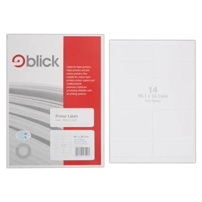 THESE Blick Labels come in a pack of 14Per Sheet 100 Sheets and are Rectangular in shape and White in colour. Each individual Labels size are 99.1mm x 38.1mm and there are 1400 included BLICK have a massive range of office, school and warehouse labels that are suitable for everything from file organisation, reward charts, letter labels and office signs AVAILABLE as small packs, office packs, warehouse packs, on a roll, on lable sheets for printers, mixed packs and assorted colours STICKERS for school, home, reward charts, height charts and more, Blick's self adhesive stickers come in a range of colours and sizes, from hearts to stars and cirles to rectangles ORGANISE your cupboards and home or in the office, labels for jars, spices, home baking, in tray, files and more with Blick's comprehensive range of labels and stickers