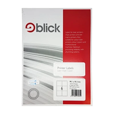 THESE Blick Labels come in a pack of 6Per Sheet 100 Sheets and are Rectangular in shape and White in colour. Each individual Labels size are 99.1mm x 93.1mm and there are 600 included BLICK have a massive range of office, school and warehouse labels that are suitable for everything from file organisation, reward charts, letter labels and office signs AVAILABLE as small packs, office packs, warehouse packs, on a roll, on lable sheets for printers, mixed packs and assorted colours STICKERS for school, home, reward charts, height charts and more, Blick's self adhesive stickers come in a range of colours and sizes, from hearts to stars and cirles to rectangles ORGANISE your cupboards and home or in the office, labels for jars, spices, home baking, in tray, files and more with Blick's comprehensive range of labels and stickers